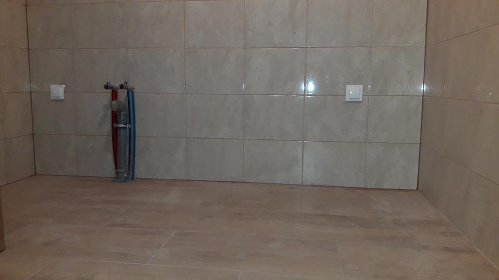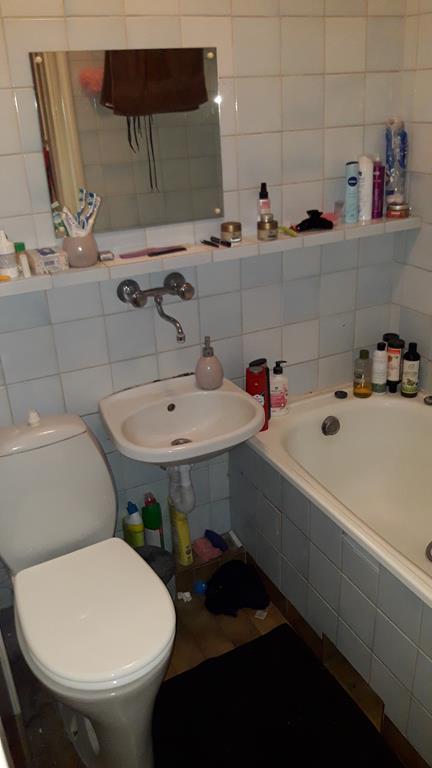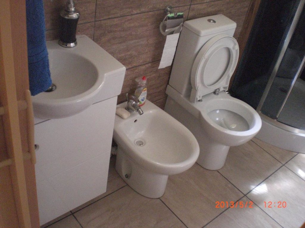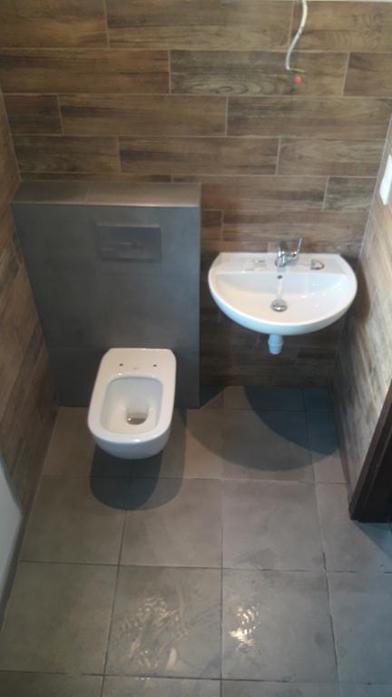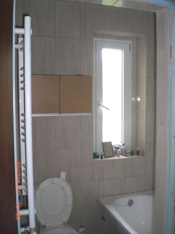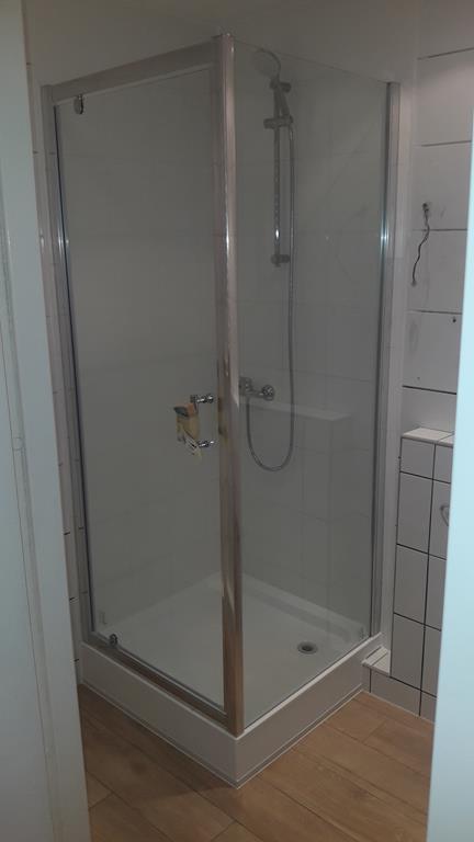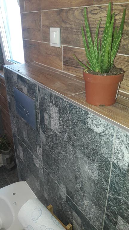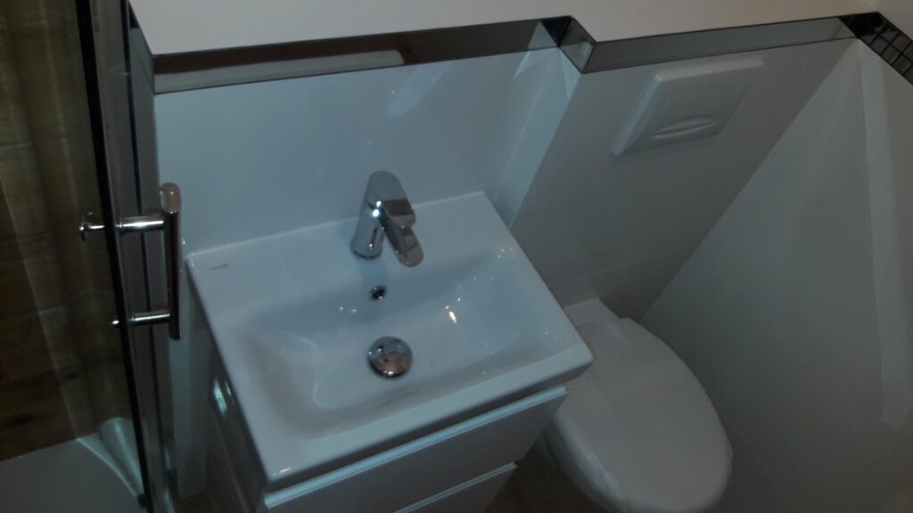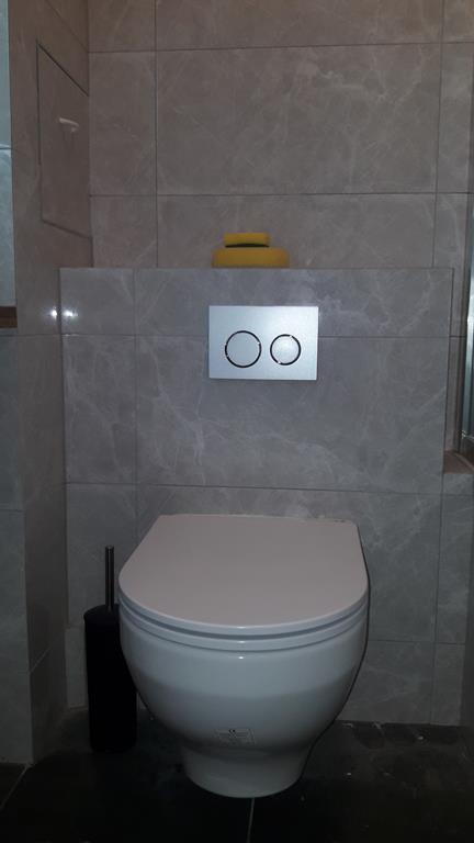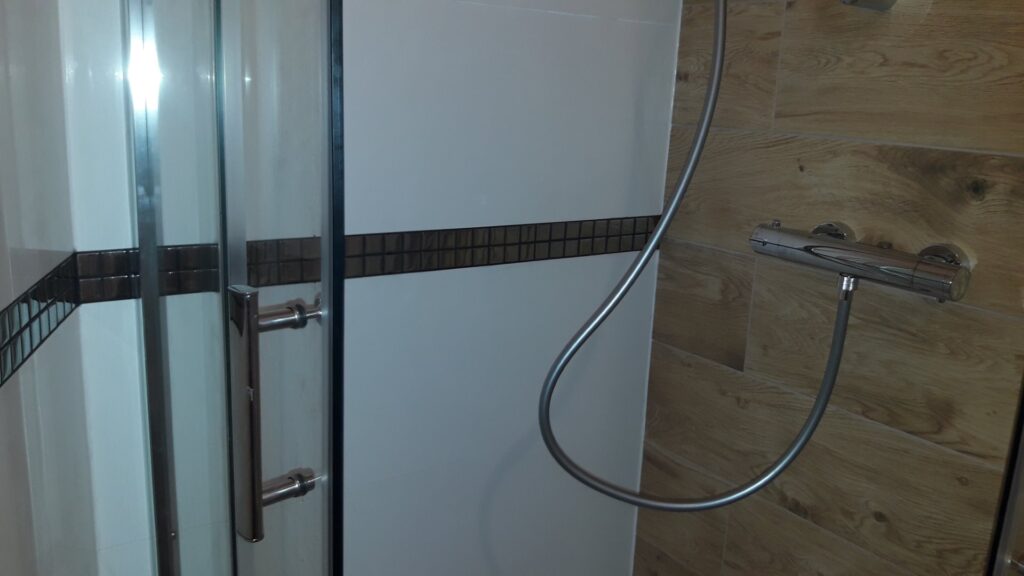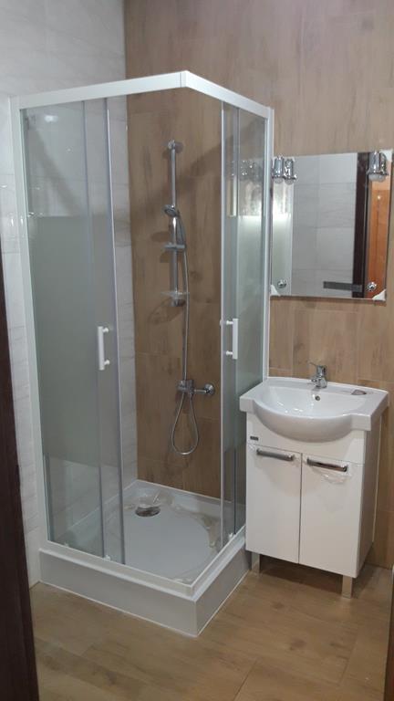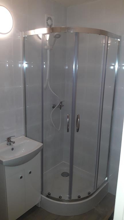 Po remoncie generalnym wymieniono w łazience całą instalację hydrauliczną i elektryczną , wykonano nowe tynki , zabudowę sufitu z gips-kartonu, nowa armatura z umywalką i toaletą typu slim oraz bidetem, dalej na prawo widoczna kabina prysznicowa, od lewej wąskie wejście więc wstawione drzwi harmonijkowe, na podłodze nowy gres , ściany wyklejone glazurą. Pralkę przesunięto do dużego przedpokoju wraz z bojlerem i zabudowano.