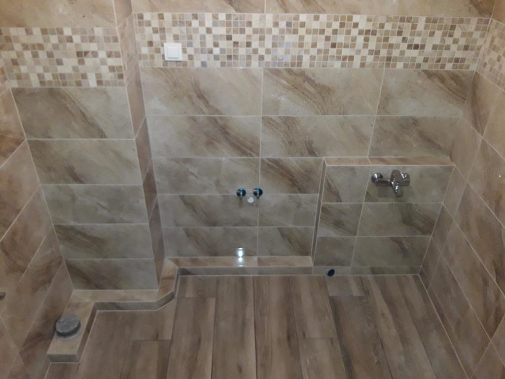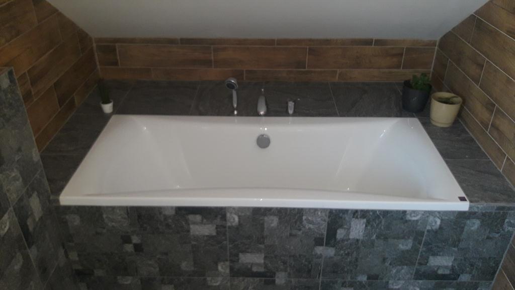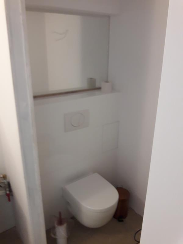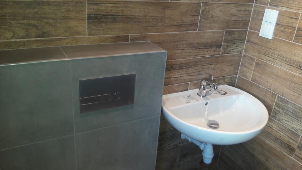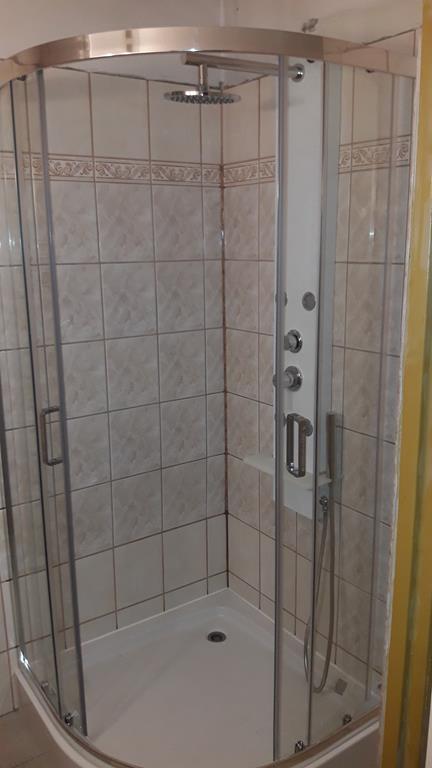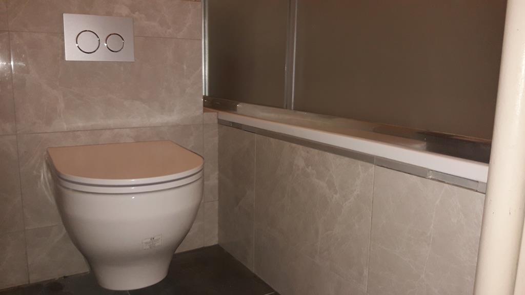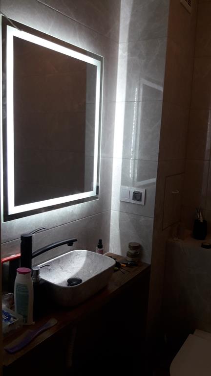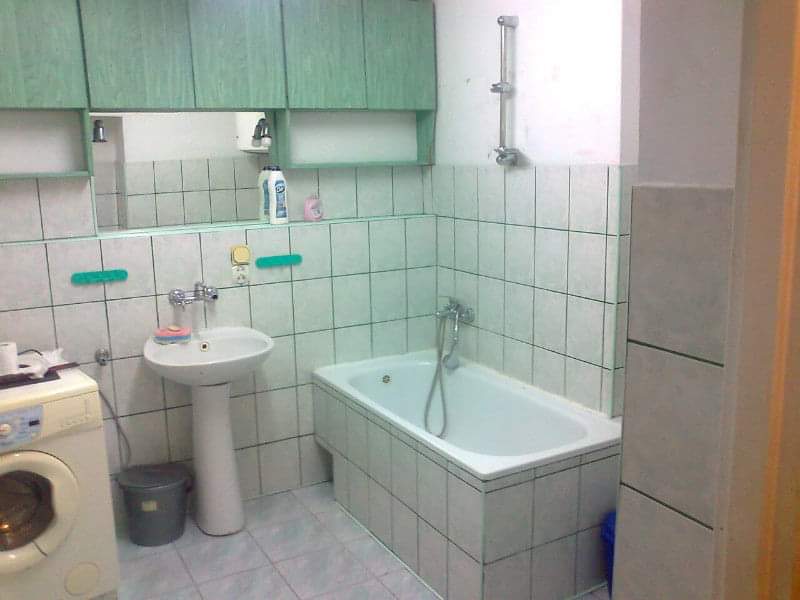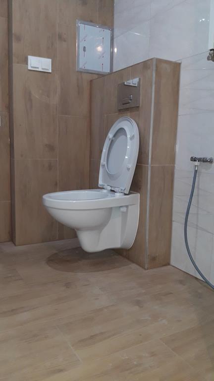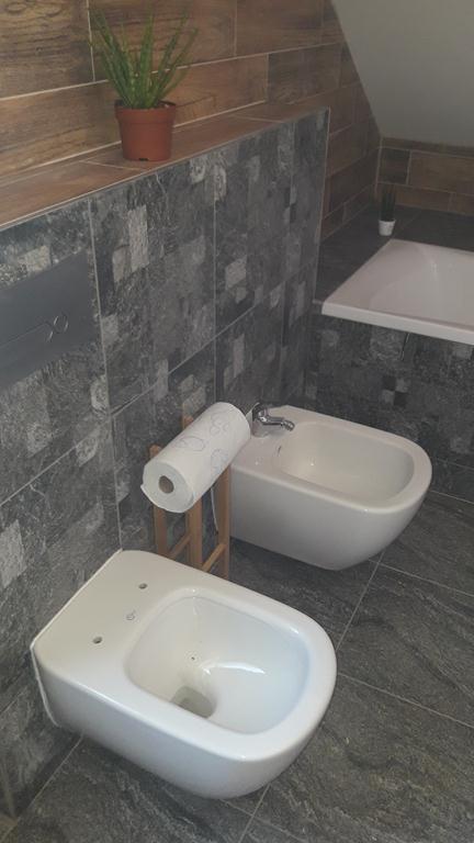 Po remoncie generalnym wymieniono w łazience całą instalację hydrauliczną i elektryczną , wykonano nowe tynki , zabudowę sufitu z gips-kartonu, nowa armatura z umywalką i toaletą typu slim oraz bidetem, dalej na prawo widoczna kabina prysznicowa, od lewej wąskie wejście więc wstawione drzwi harmonijkowe, na podłodze nowy gres , ściany wyklejone glazurą. Pralkę przesunięto do dużego przedpokoju wraz z bojlerem i zabudowano.