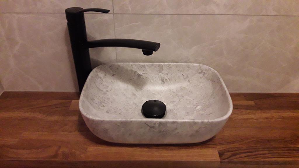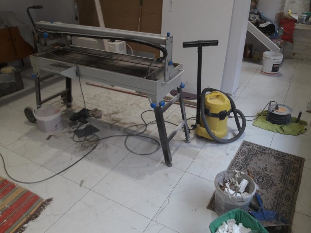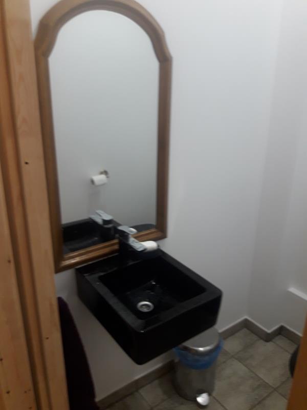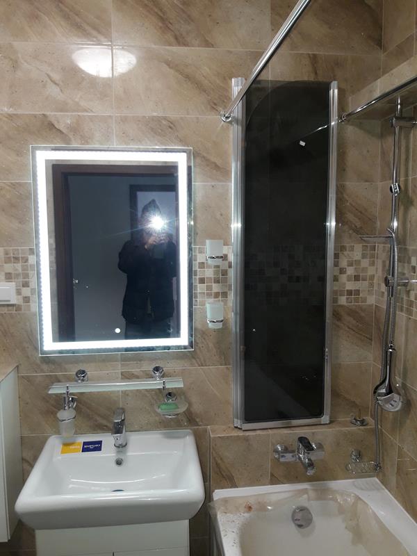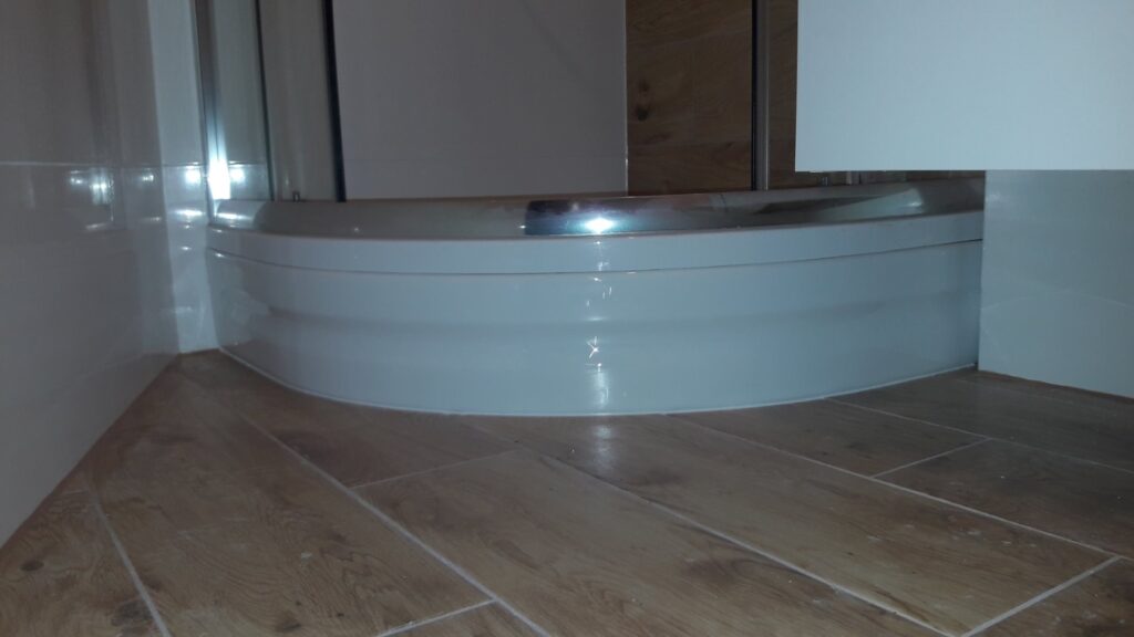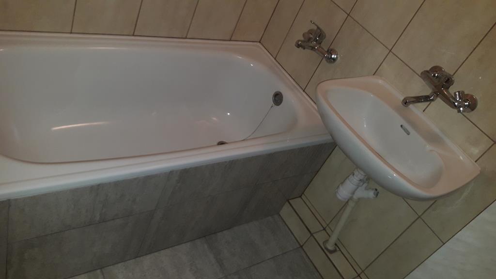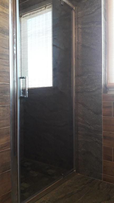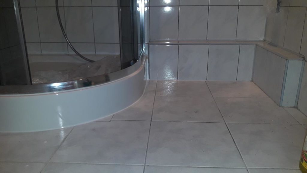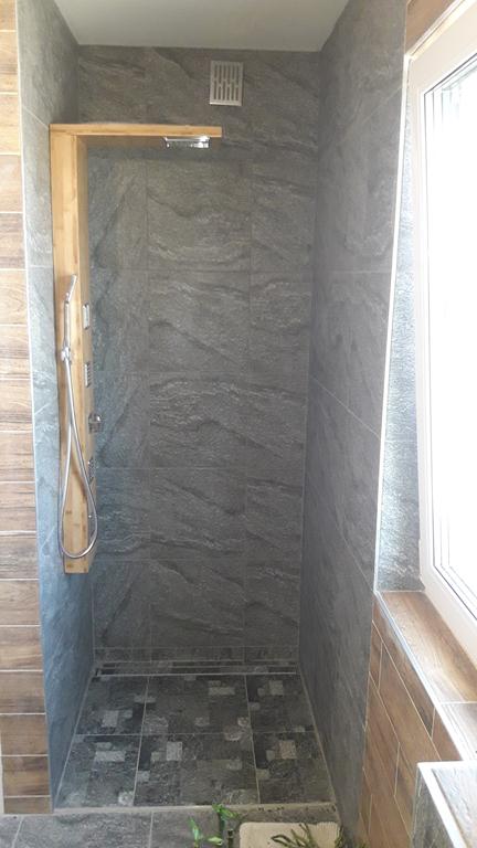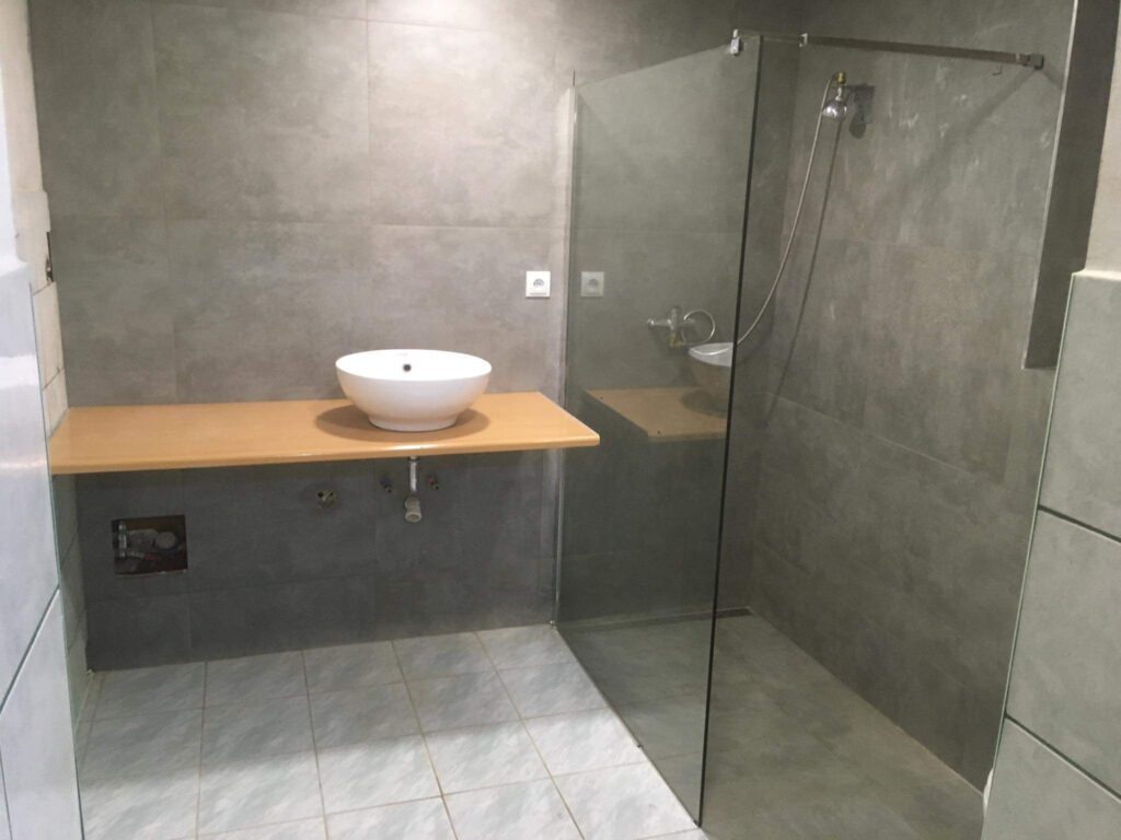 Po remoncie generalnym wymieniono w łazience całą instalację hydrauliczną i elektryczną , wykonano nowe tynki , zabudowę sufitu z gips-kartonu, nowa armatura z umywalką i toaletą typu slim oraz bidetem, dalej na prawo widoczna kabina prysznicowa, od lewej wąskie wejście więc wstawione drzwi harmonijkowe, na podłodze nowy gres , ściany wyklejone glazurą. Pralkę przesunięto do dużego przedpokoju wraz z bojlerem i zabudowano.