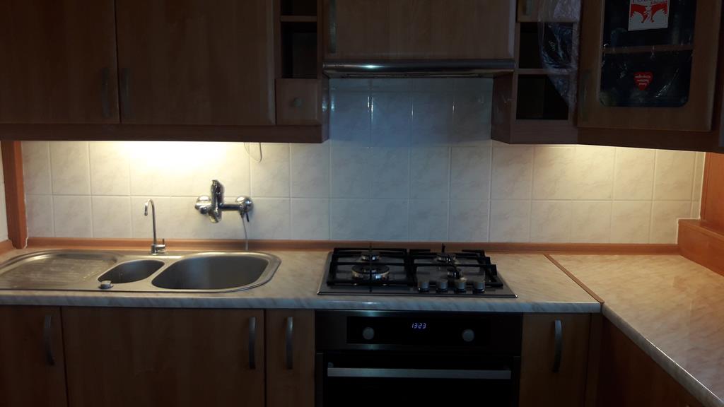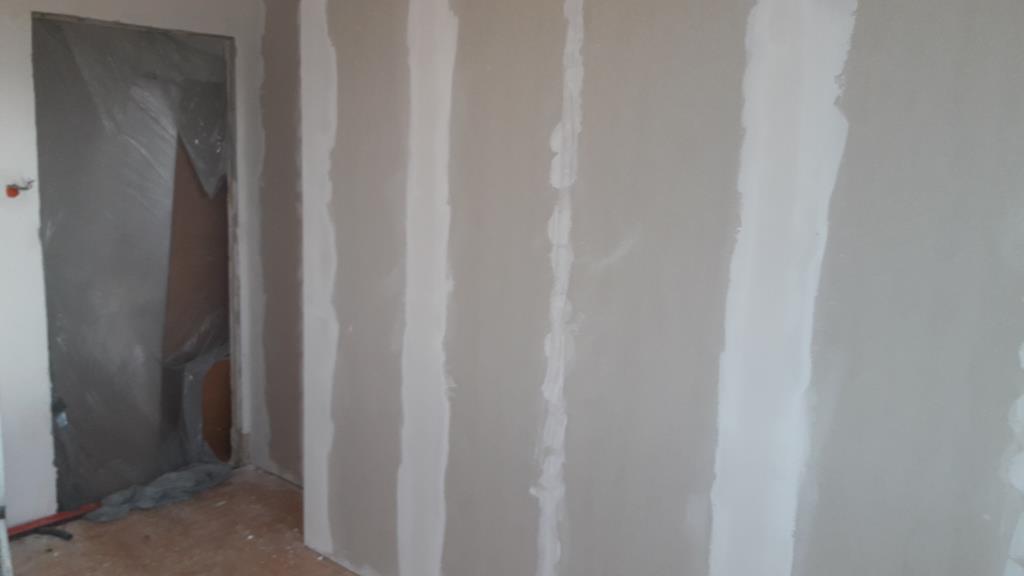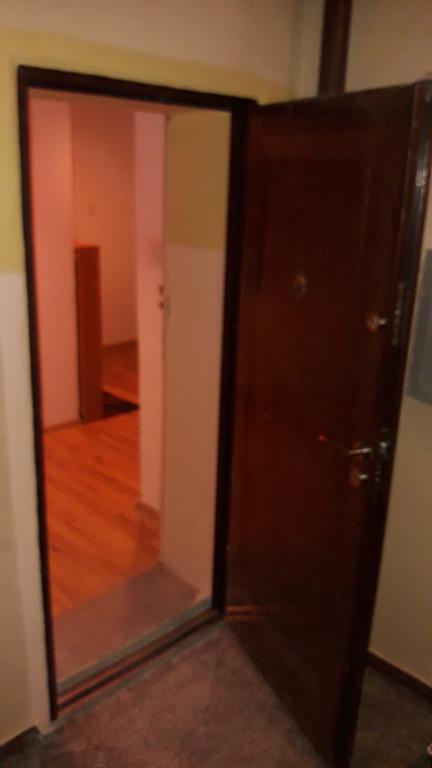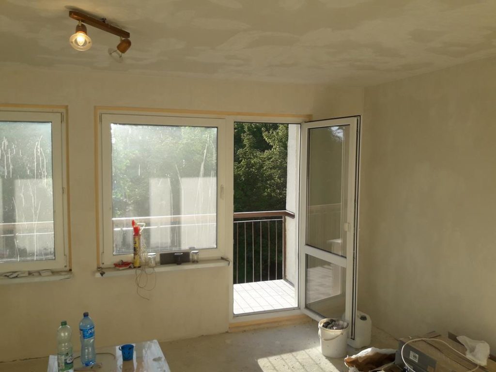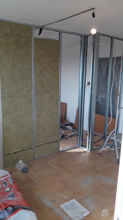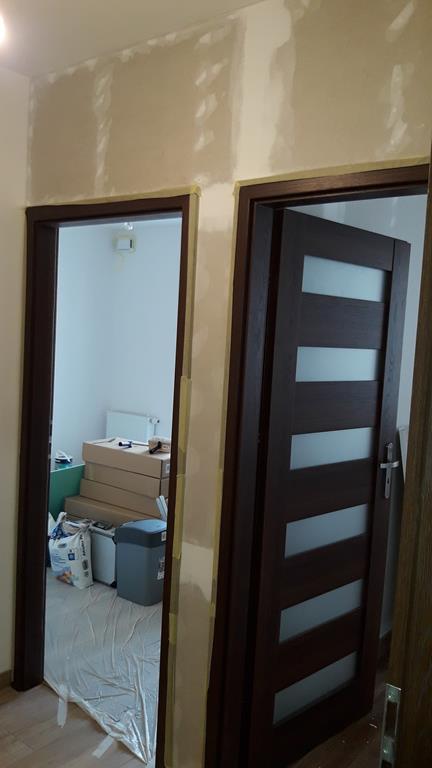 Przebudowane mieszkanie dwu pokojowe na studio, po wyburzeniu ścianki powstała widoczna część kuchenna z blatem barowym i salonem na prawo. W części kuchennej gres a w salonie panele podłogowe . Wykonano nowe zaprawy tynkarskie , sufit zabudowano gips-kartonem.