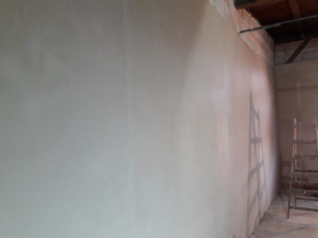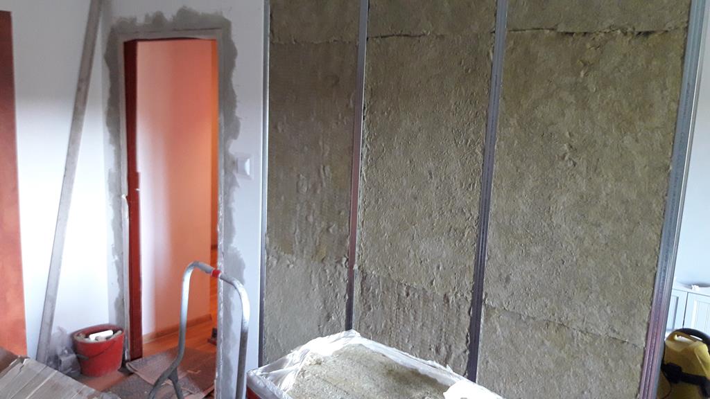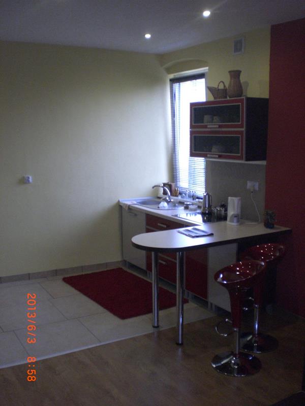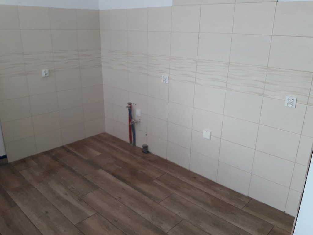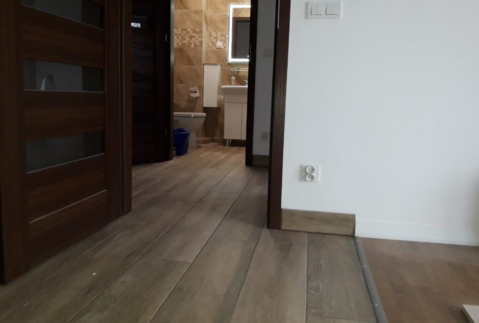 Przebudowane mieszkanie dwu pokojowe na studio, po wyburzeniu ścianki powstała widoczna część kuchenna z blatem barowym i salonem na prawo. W części kuchennej gres a w salonie panele podłogowe . Wykonano nowe zaprawy tynkarskie , sufit zabudowano gips-kartonem.