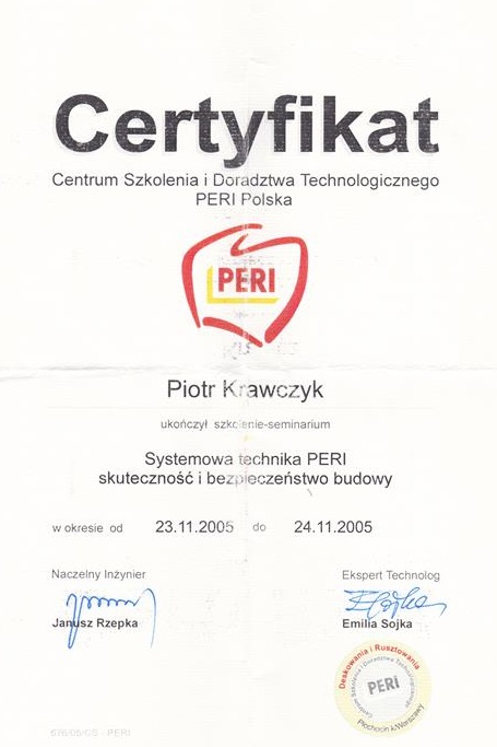 Certyfikat szkolenia PERI