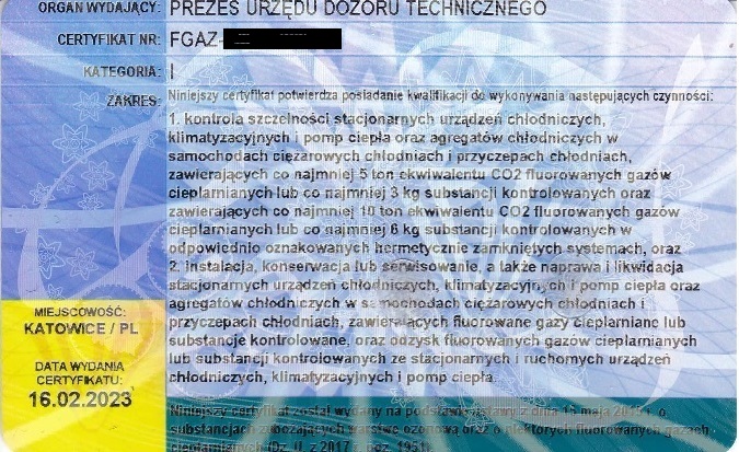 F-GAZY – Potwierdzenie z UDT kwalifikacji do wykonywania czynności związanych z instalacją, konserwacją lub serwisowaniem a także naprawą i likwidacją stacjonarnych urządzeń chłodniczych, klimatyzacyjnych, pomp ciepła oraz agregatów chłodniczych, zawierających fluorowane gazy cieplarniane lub substancje kontrolowane.