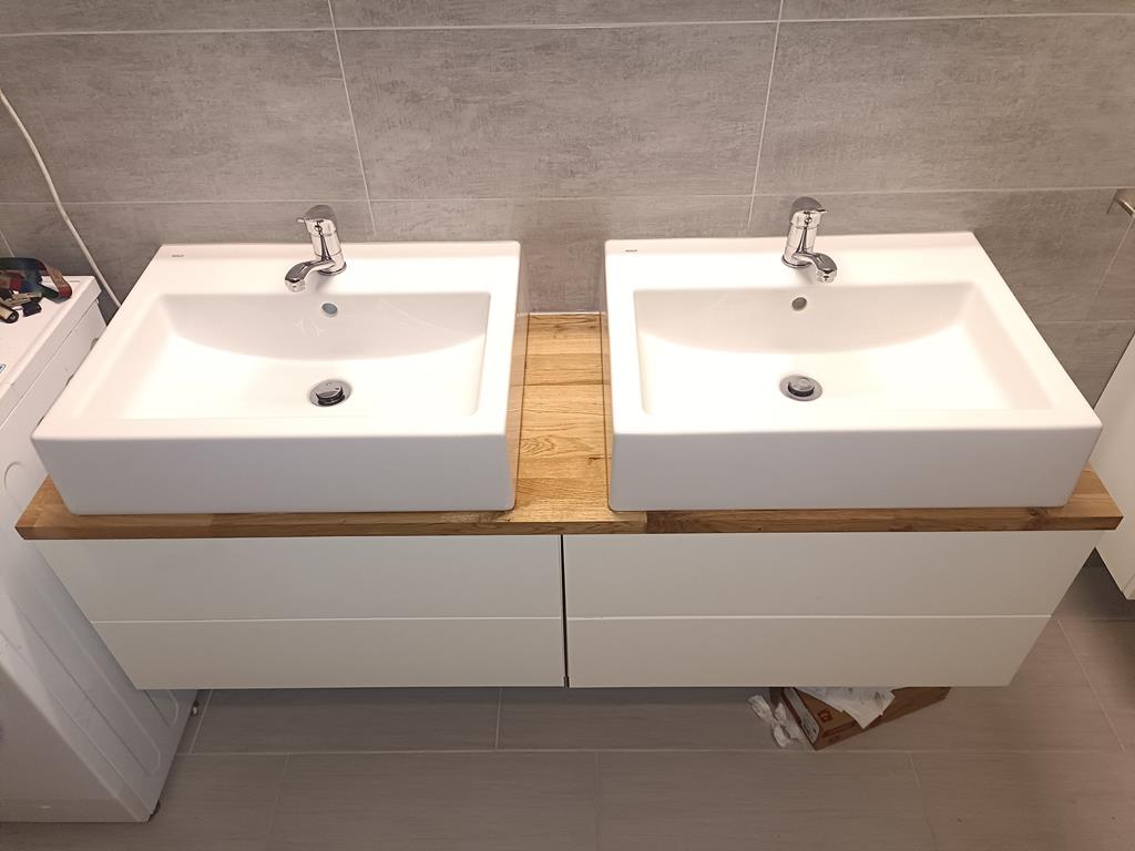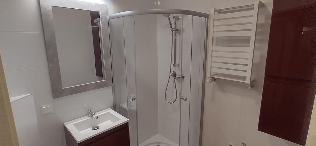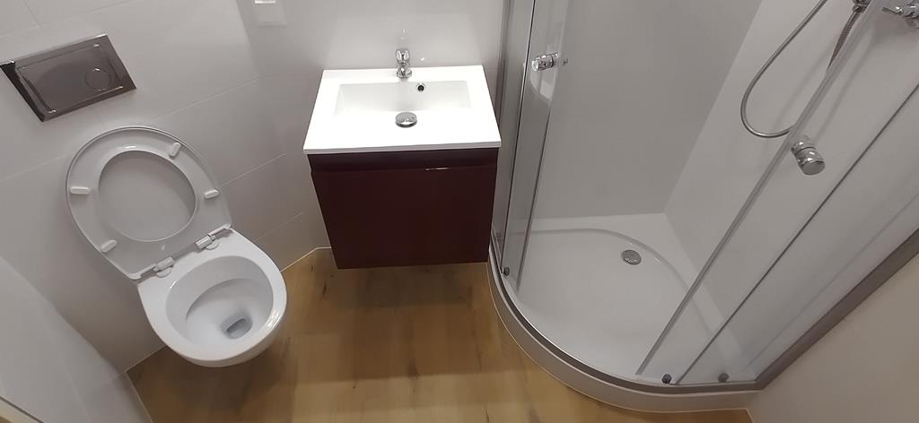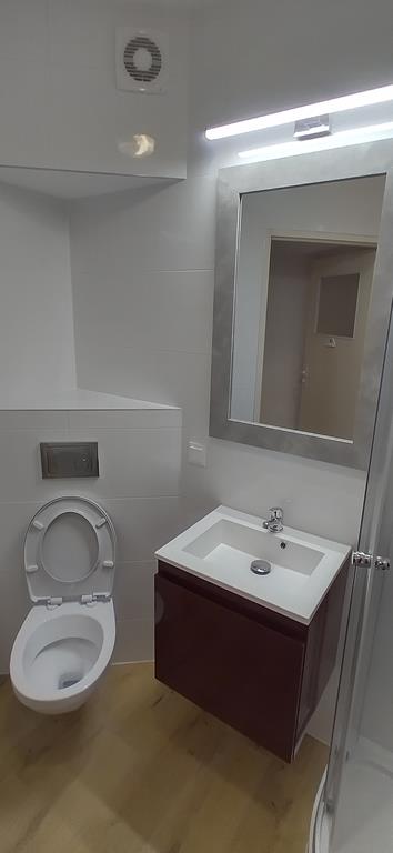 WIDOK ŁAZIENKI PO REMONCIE GENERALNYM; HYDRAULIKA-CAŁA-NOWA, ELEKTRYKA, ZABUDOWY G/K, STELAŻE PODTYNKOWE, KAFLE, PÓŁKA-ZABODOWA-WENTYLACJI MONTAŻ; KABINY, SZAFY/UMYWALKI/ZLEWU PODWIESZANYCH, MISKI WC, GRZEJNIKA, DESZCOWNICA, LUSTRO-REWIZJA-LICZNIKÓW, KAFLE DOCINANE DO KONTÓW OBUSIECZNYCH. PRZENIESIENIE STELAŻ WC NA LEWO DO WNĘKI / PRALKA I GRZEJNIK NA KONIEC W PRAWO ŁAZIENKI